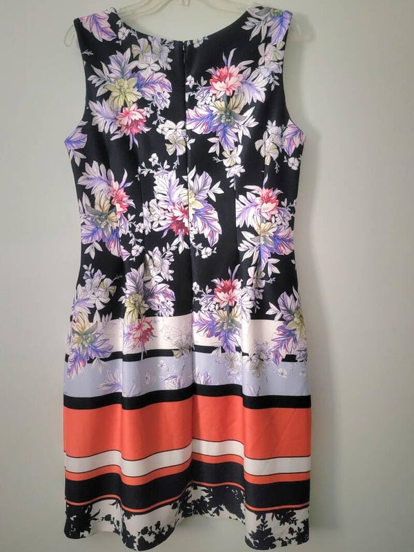 Beautiful Floral Dress with invisible back zipper and has side pockets on both sides great colors of Black, greens, Red, off white, Silver Grey and in very good condition, Such a lovely Piece.