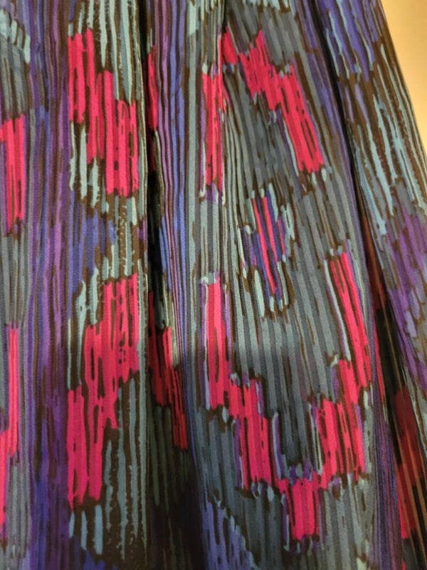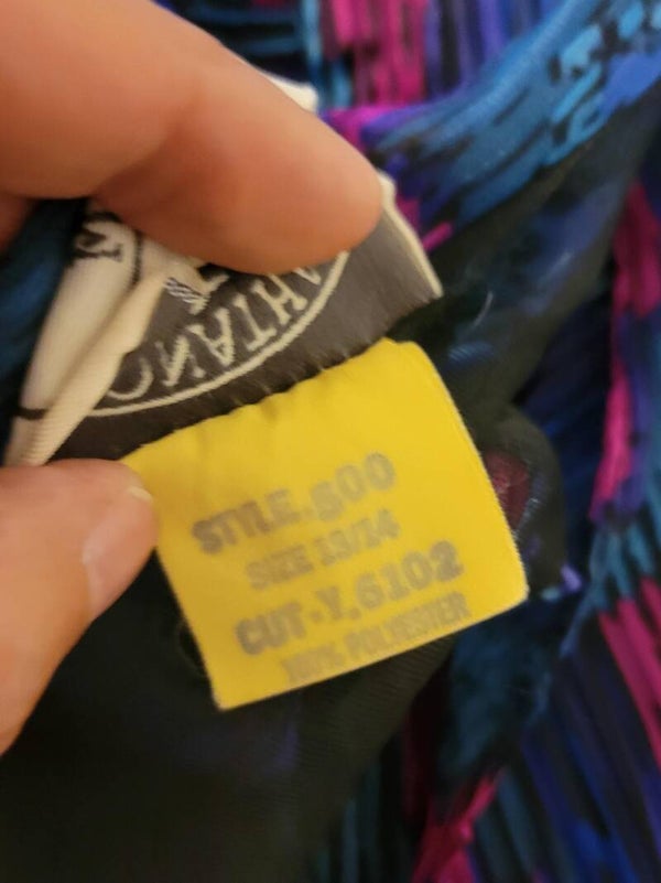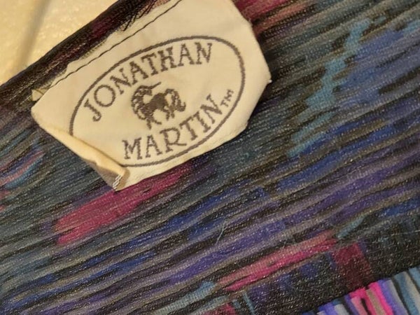 Vintage Jonath Martin Sz. 13/14 U.S.A. 80's Padded Shoulders 2 Button Blouse Quarter Length Sleeves 20.5" .Shoulder width 4" .Total length 25.5" .shoulder to shoulder 16.5" .Pit to Pit 22" Bust up to 44" Cuft width 10" .Bottom width 20" 40" around .Purple Teal Blue's .100% Polyester .Dry clean only