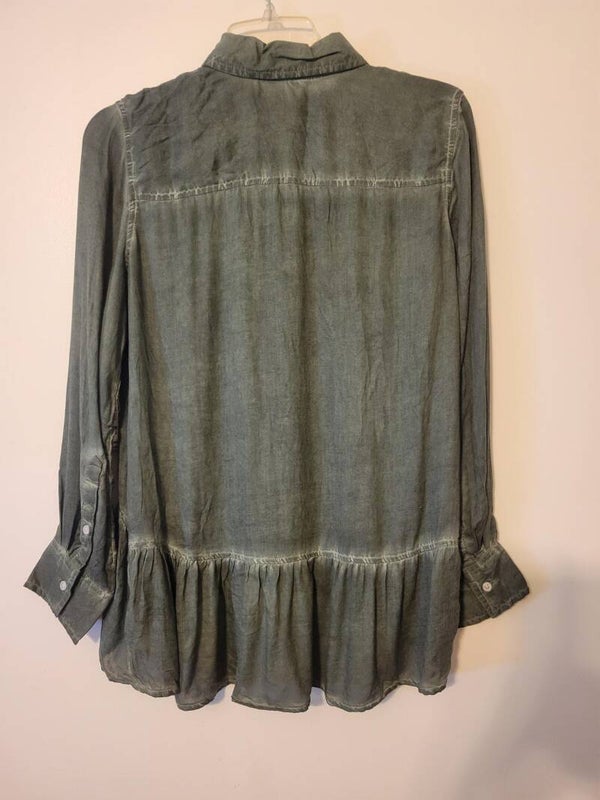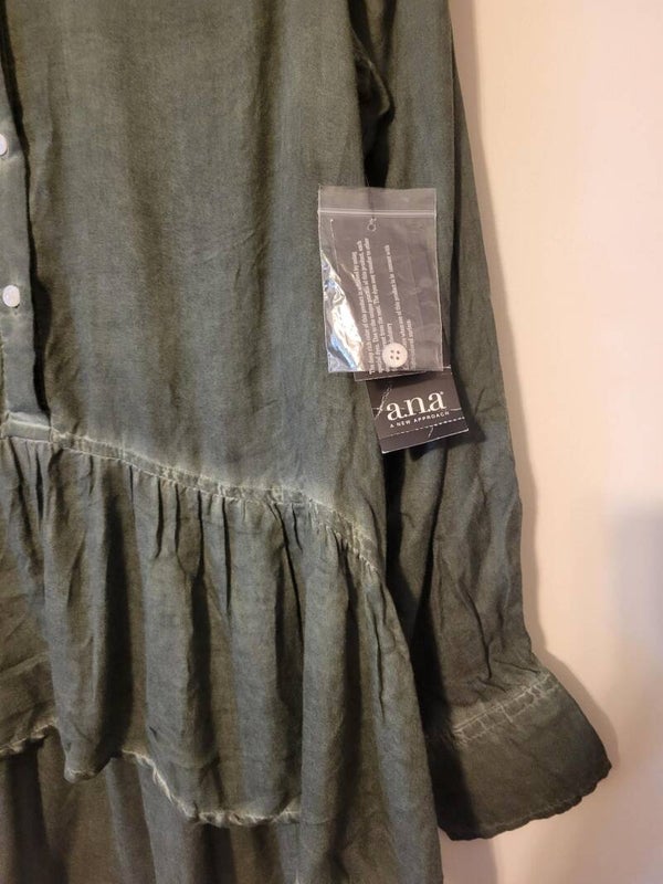 A.N.A. Small Flagstaff Green Button up Pullover Ruffled Long SL Top NEW .Shoulder width 4.5" .Long Sleeves 23.5" .Pit to Pit 22.5 Bust up to 45" .waist 22" across total 44" around .Shoulder to front hem 24" .Shoulder to back hem 28" .Hi-lo .100% Rayon