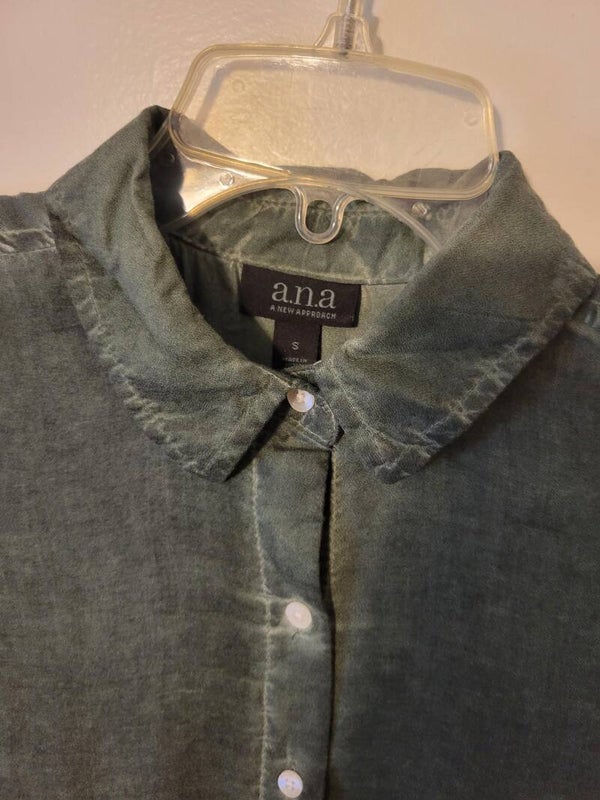 A.N.A. Small Flagstaff Green Button up Pullover Rayon Ruffled Long SL Top NEW