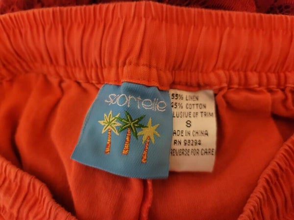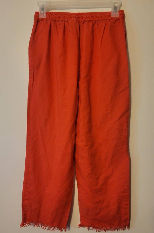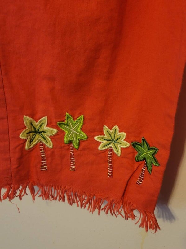 Vtg. Sportelle Sz. 8 Embroideried fringed High Waisted Capris Tie elastie waist 13" - 16' . waist 26" - 32" . Hips 38' . Rise 11.5" . Inseam 22" -22.5 fringe . Total length 32" - 32.5 fringe . 55% Linen 45% Cotton