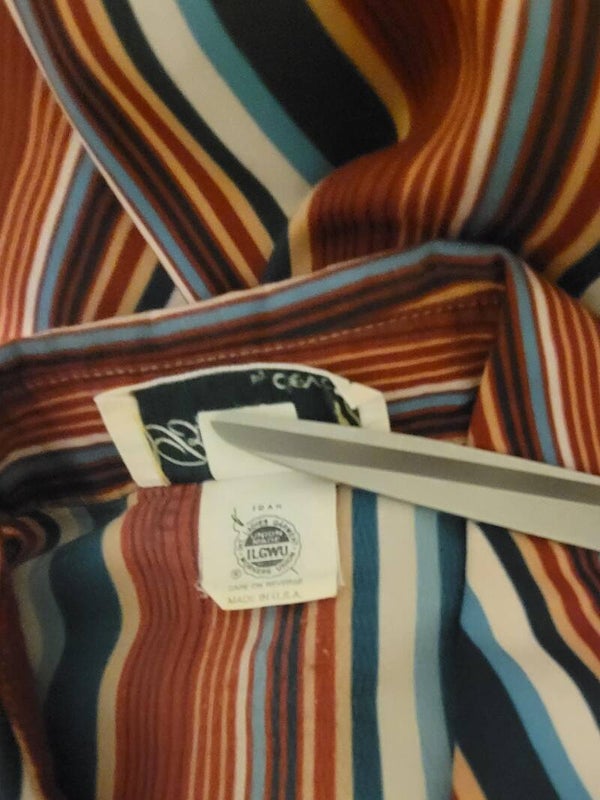 . No tag for fabric content has a satin feel and is lightweight . Union Made Tags . Shoulder width 5" . Long sleeves 23" . Pit/Pit 20" . Bust up to 40" . Total length 25.5" . This is a great Piece and still around