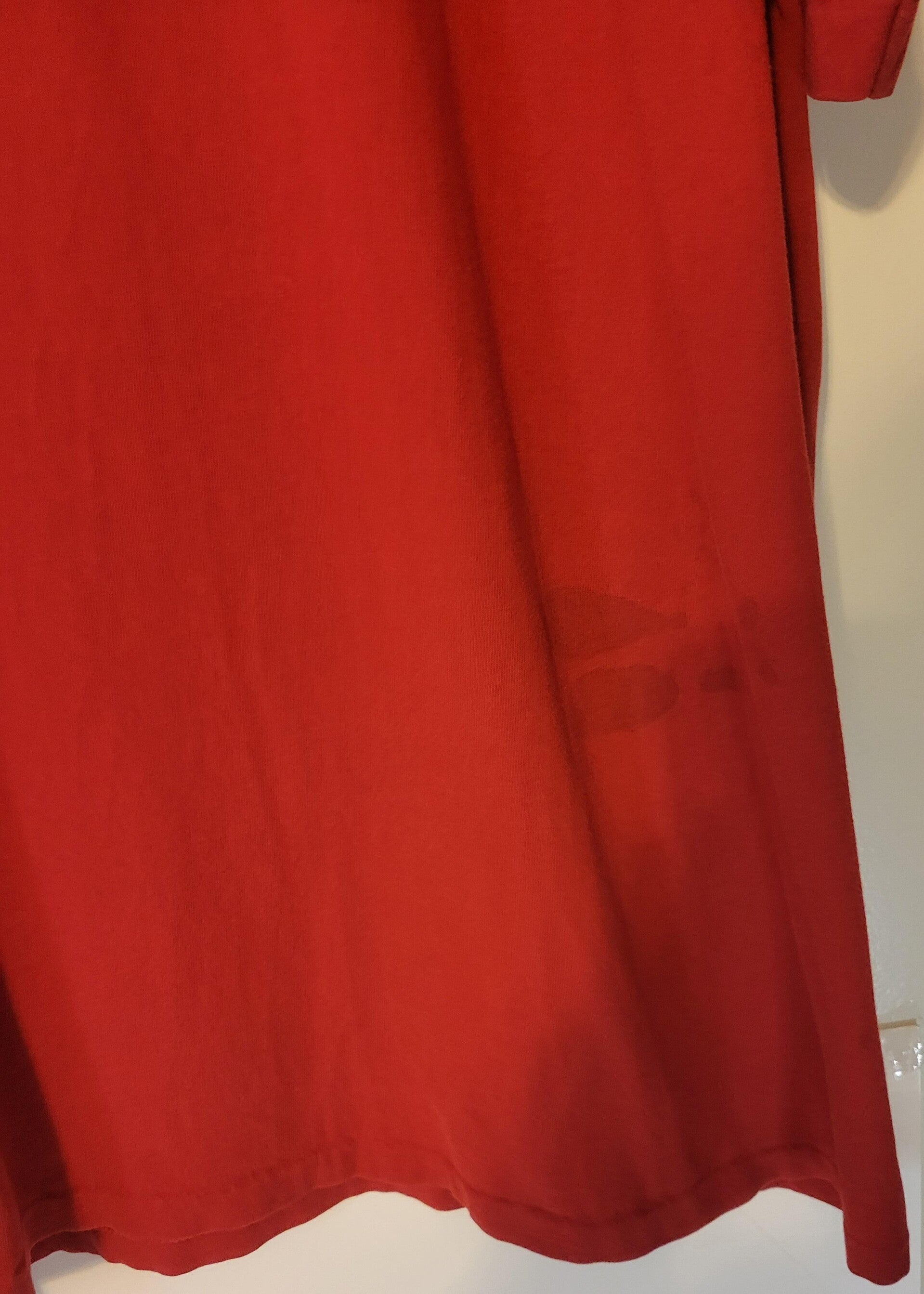 . Shoulder width 8" . Short Sleeves 10" . Pit 26" across . Chest up to 52" . Total length 32" . 100% Cotton . Stained all over could use as a work shirt . Single Stitch