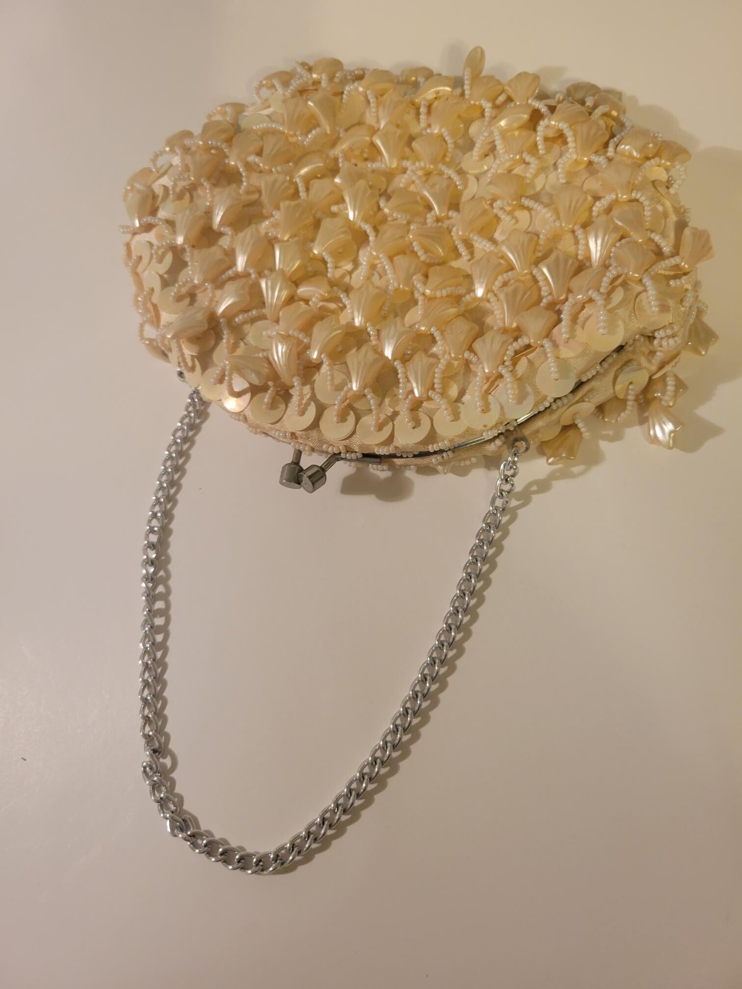 Vintage Evening Beaded Bag Shells Chain 6 x 5 x 1/2" . Kiss Lock Clasps . 12" Silver Chain . Silver Clasp . Shell Beads . Ivory Lining . Needs Cleaned up a little . 1 Pocket inside
