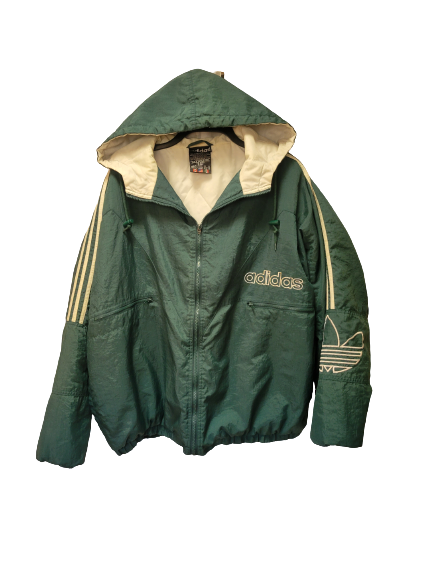90's Adidas XL 3 Stripes Zip Up Puffer Coat 6 Pockets Embroidered Logo Drawstring