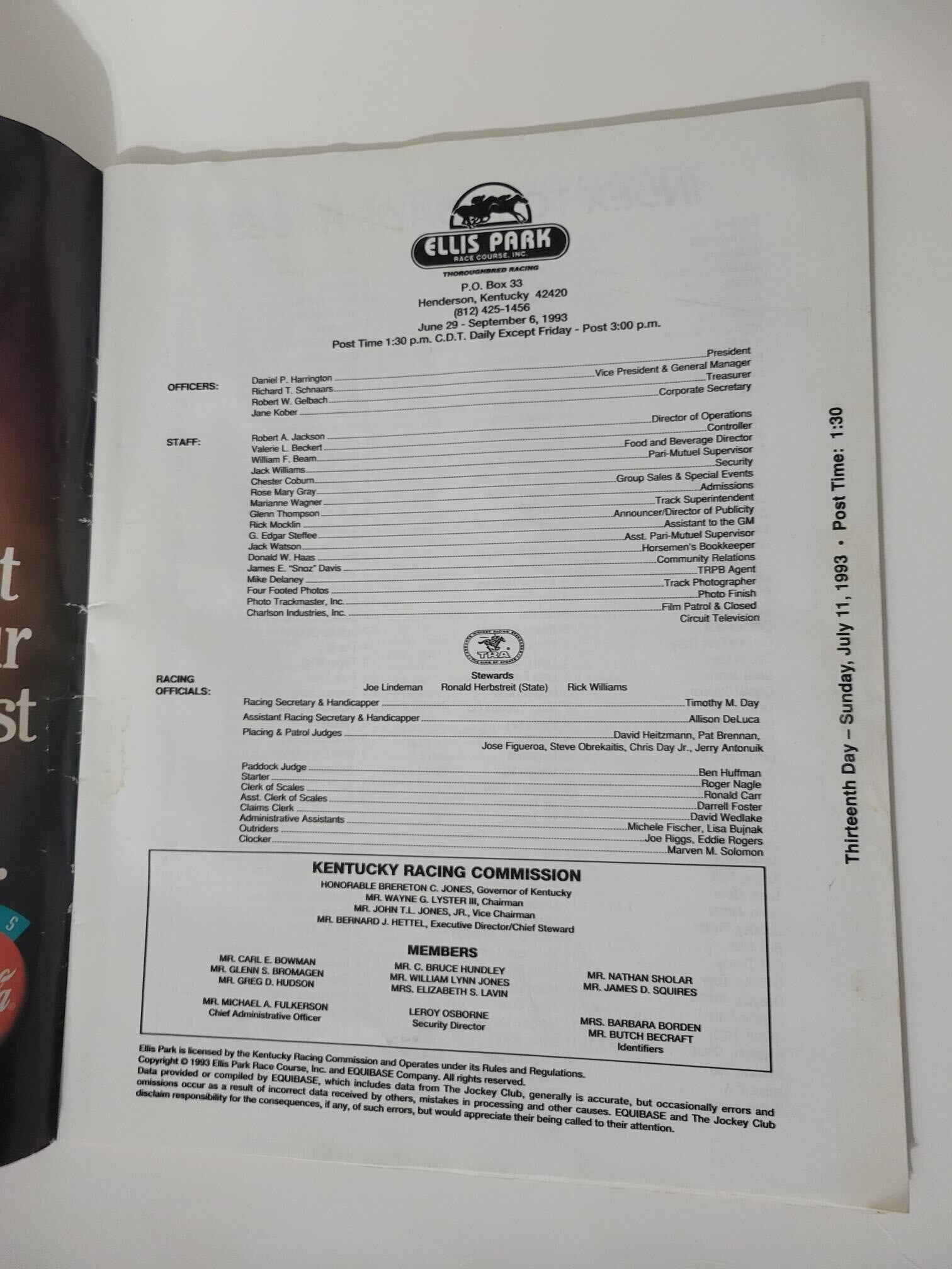 "1993" Ellis Park Thoroughbred Racing Program Book June 29 through Sept. 6 Souvenir