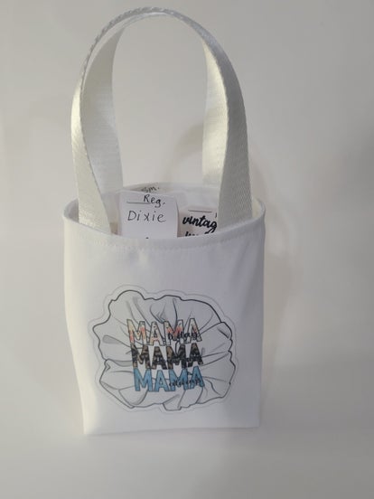 . MAMA . Hand made by me . You get the Little Tote with 4 random Hair Scrunchies picked by me, Surprise !! I hope I get you right. These Little Totes can be giving as a Gift or to your Friends or your Co-Workers, A gift for a Birthday Girl or use them for a Christmas stocking stuffer. or for yourself.