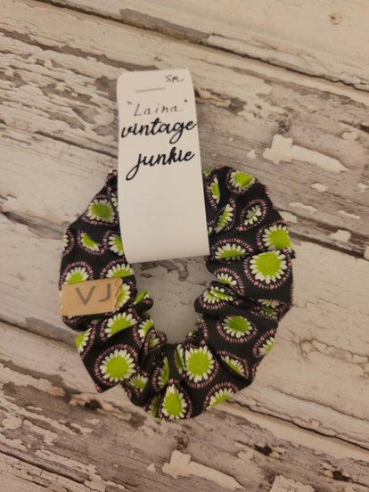 Her name is Laina Sz. REGULAR Green Burst on dark background with a hint of pink, Hair Scrunchie with elastic inside handmade by vintage junkie Cotton fabric Machine washable