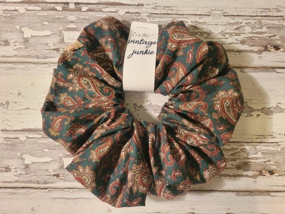 her name is Cielle Sz. XXL Green /Gold Paisley Hair Scrunchie with elastic inside Cotton Fabric machine washable, Made by vintage junkie (Limited)